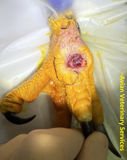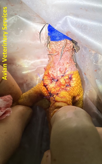 We decided the only chance of moving forward was to excise this ‘non-healing’ area, but the problem we then had is that due to the non-elasticity of the scaly skin we would be unable to close the deficit without some form of skin graft. Also, the lesion was directly over of the lubricated tendon sheaths and extensor tendons of the hind toe that could easily be damaged during surgery in this area.